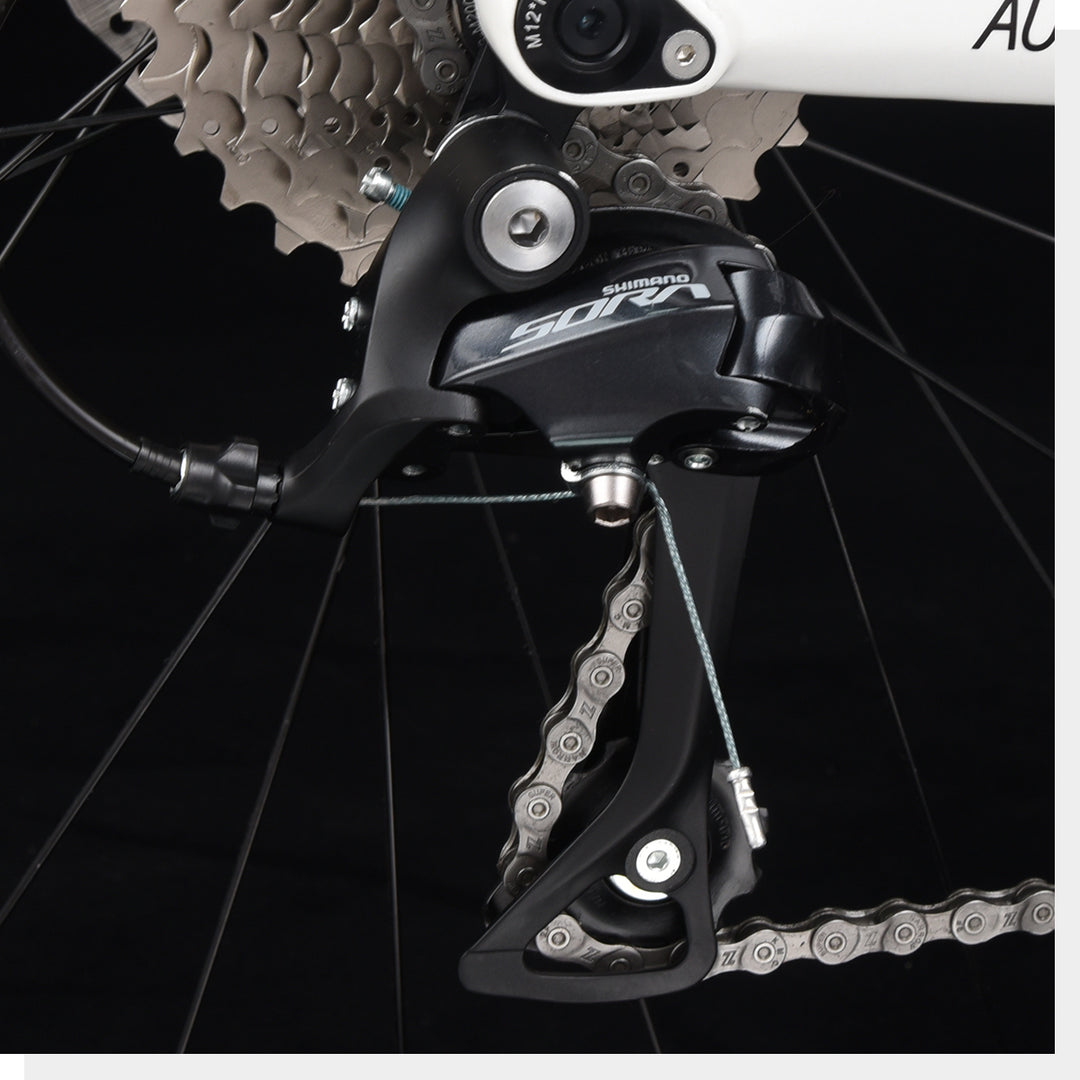 最先端の SHIMANO SORA FD-R3000 フロントディレイラーでサイクリングのパフォーマンスを向上させます。延長されたアーム設計により、2x9 スピードシフトが簡単に行え、より軽量で効率的なギアチェンジ体験を実現します